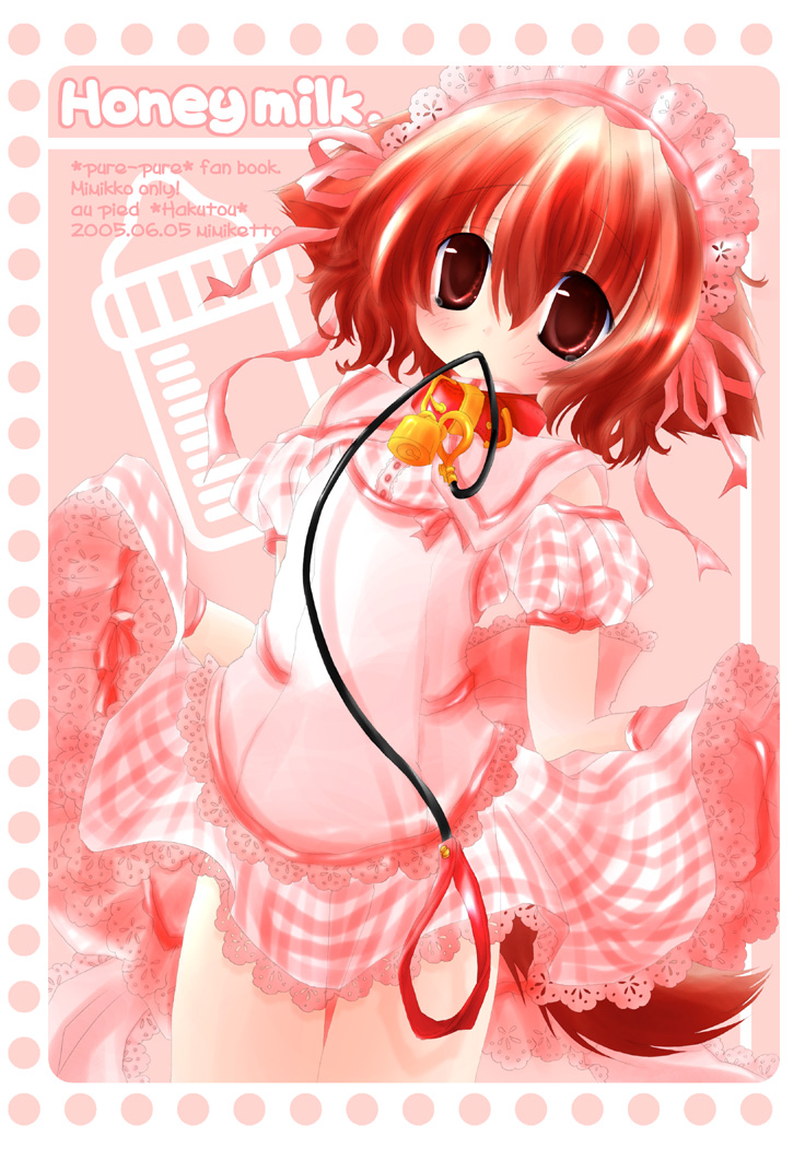 05.05.21 みみけっと12で出したぴゅあぴゅあ本の表紙ですー。 メイド服(ということにさせてください)ひなたさん。 幼い感じにしたかったのでメイド服もおもちゃっぽく!みたいな。 あと、ちっちゃい子がピンクのギンガムチェック着てるのも萌えです。 南京錠は一度描いてみたかったので。首輪的な意味で萌えなのです。 そしてわんこは、自分でリードくわえてたり首輪くわえてたりが、 とってもとっても大事だと思います!と主張。